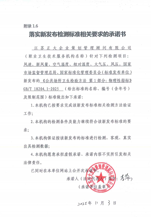 落實新發(fā)布檢測標(biāo)準(zhǔn)相關(guān)要求的承諾書