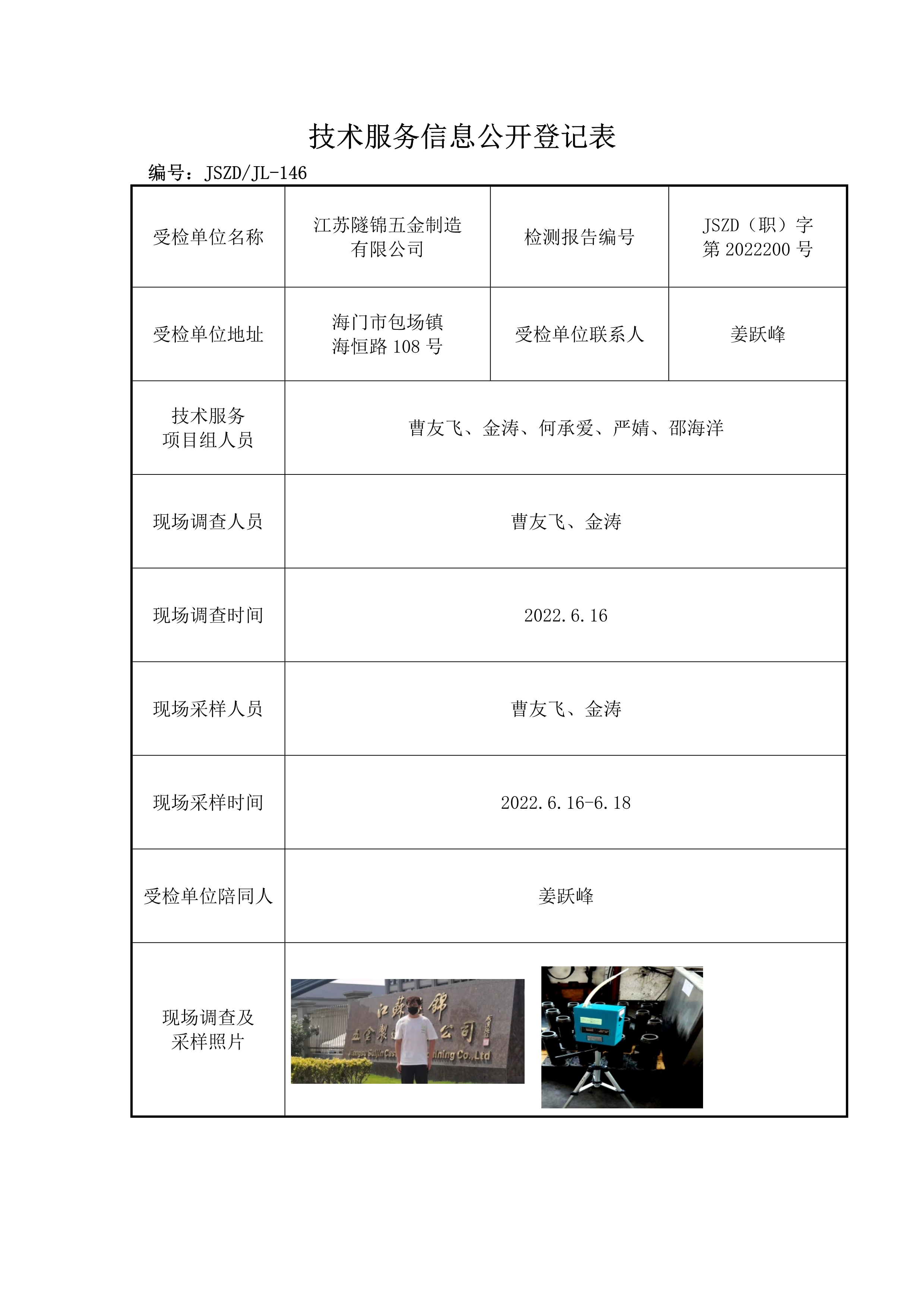 2021-2022南通地區(qū)檢驗檢測項目公開——正大JSZD(職)字第2022200號江蘇隧錦五金制造有限公司職業(yè)病危害因素檢測報告